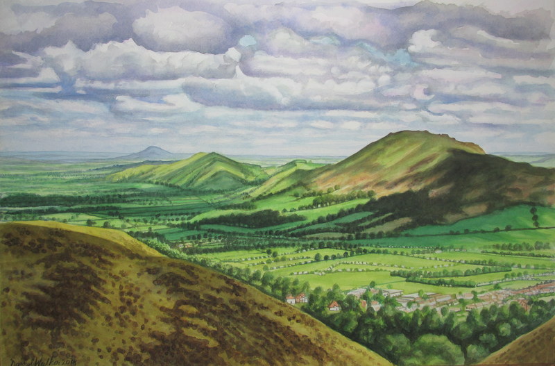 A watercolour painting by Darryl Walker featuring the view of Caradoc Lawlwy and the Wrekin from the Longmynd above Church Stretton