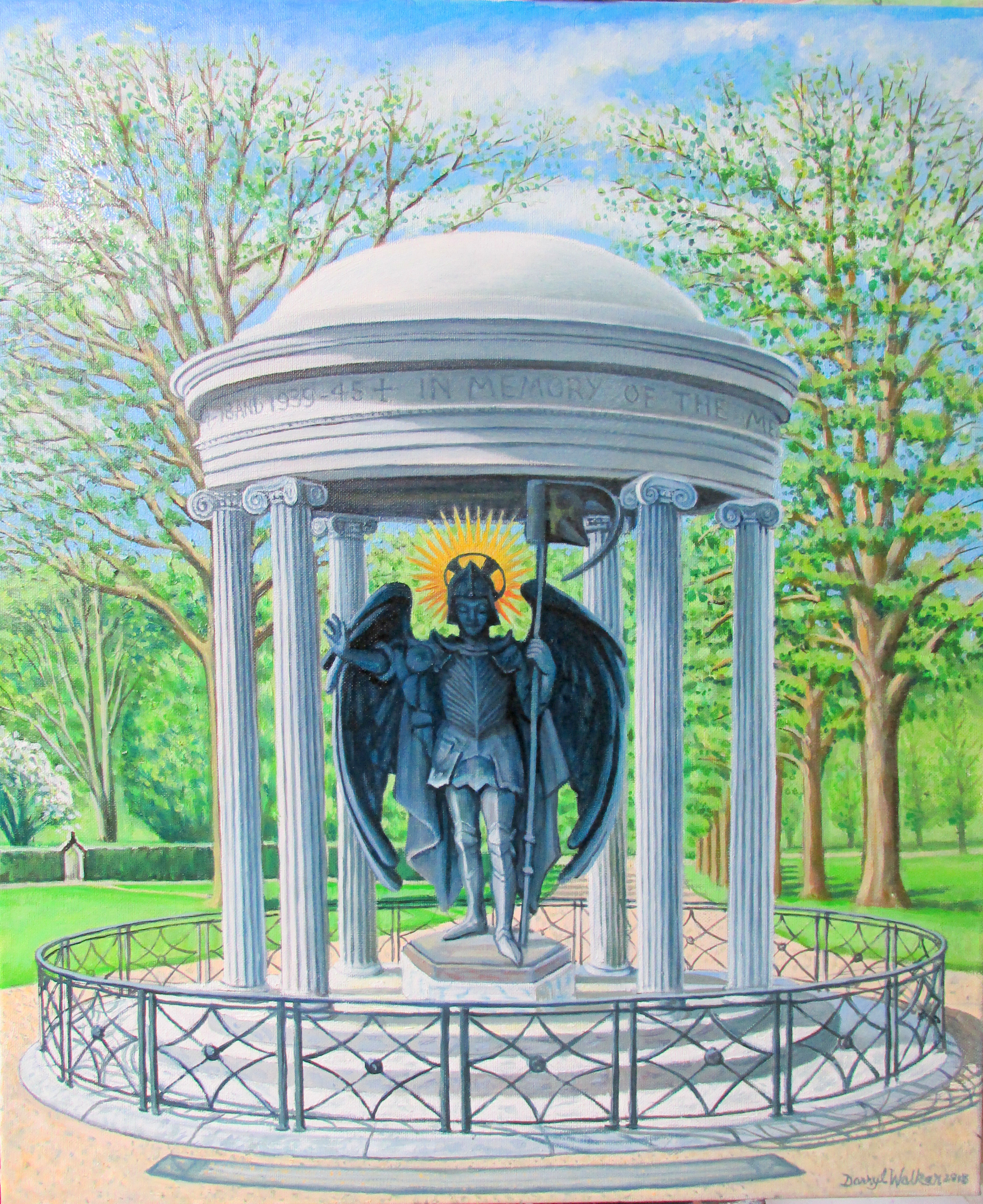 Framed original oil painting by Darryl Walker of the war memorial in Shrewsbury Quarry featuring a sculpture of St. Michael